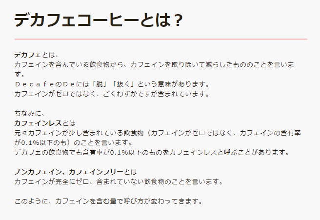 デカフェの飲食物でも含有率が0.1%以下のものをカフェインレスと呼ぶことがあります。